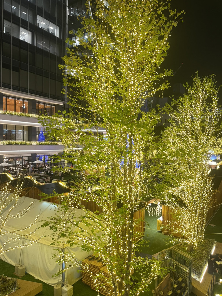 会場の樹木をストリングライトで装飾して頂きました。 ストリングライトはひも状・直線の定番のイルミネーションで、樹木やクリスマスツリーを装飾するのが定番ですが、どこにでも使える汎用性の高さが魅力的な製品です。 目立つ樹木を装飾することで、会場全体を明るい雰囲気にすることができます。